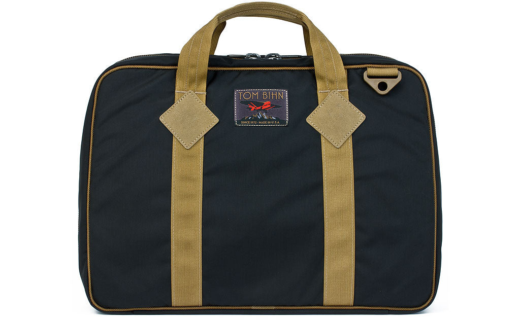 The Founder’s Briefcase is made of our 420d HT nylon Classic Parapack, both inside and out. You’ll find its smooth surface won’t collect pet hair, nor will it abrade your clothes. Because they’re exposed to the elements, we’ve used YKK Aquaguard® water-repellent zippers on exterior pockets and the main compartment. We’ve sewn them “right side up,” which means they don’t look waterproof because the coating is on the inside. We think the aesthetics are better, and the weatherproofness and durability are just as good as on the more commonly seen “upside-down” installation. The handles are reinforced with die-cut synthetic felt patches — their appearance is evocative of heavy leather, but they tend to not absorb water and require no maintenance. Other than that, you can expect the usual TOM BIHN treatment: multiple rows of stitching, finished seams, and lots of bar tacks.
