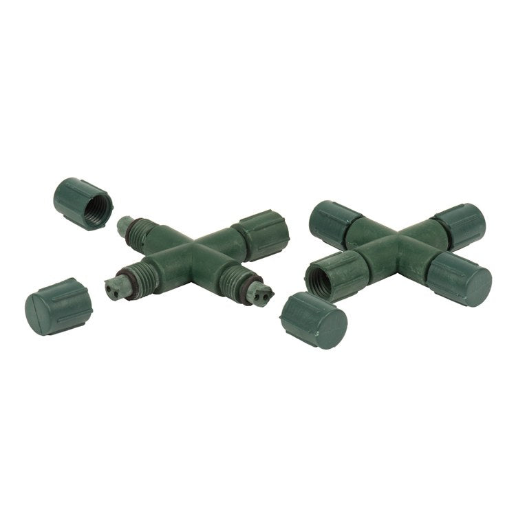 This Vickerman Coaxial X Splitters are designed for use when connecting light sets. The X configuration lets you branch out wires in four directions. The splitter features a green wire and is CSA/US listed. Set of six splitters per bag.