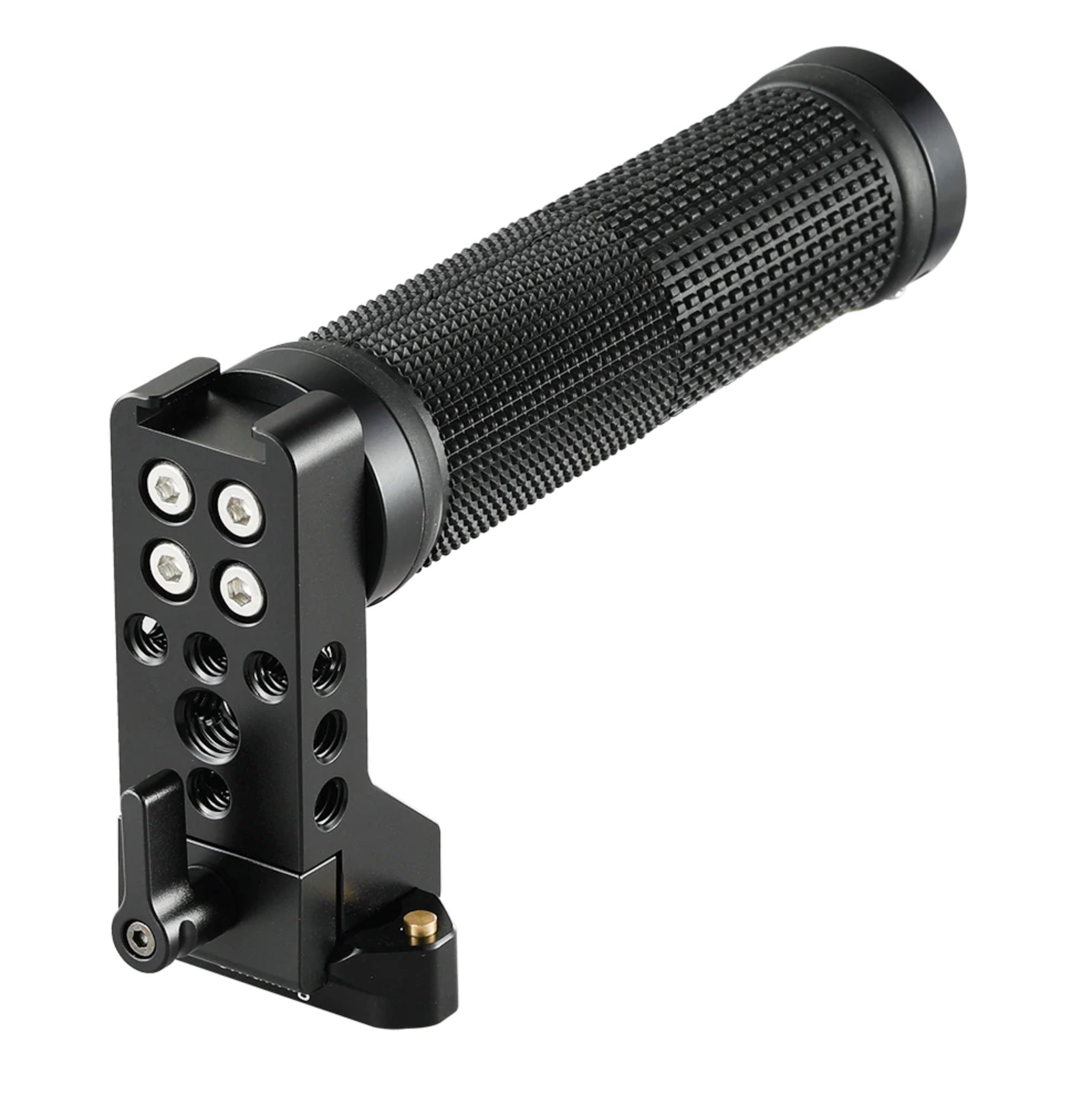 QR Safety Rail 1409 comes with spring-loaded pins on both ends to prevent accidental removal. It is compatible with NATO clamp. QR NATO Handle (Rubber) 2005 comes with a cold shoe on the top to mount standard shoe accessories. It could attach NATO rail and then be tightened via the wingnut, and it could be adjusted left and right on the rail to keep the balance. It is ergonomically designed and rubber coated, thus it offers a very good handheld experience for the cameraman.